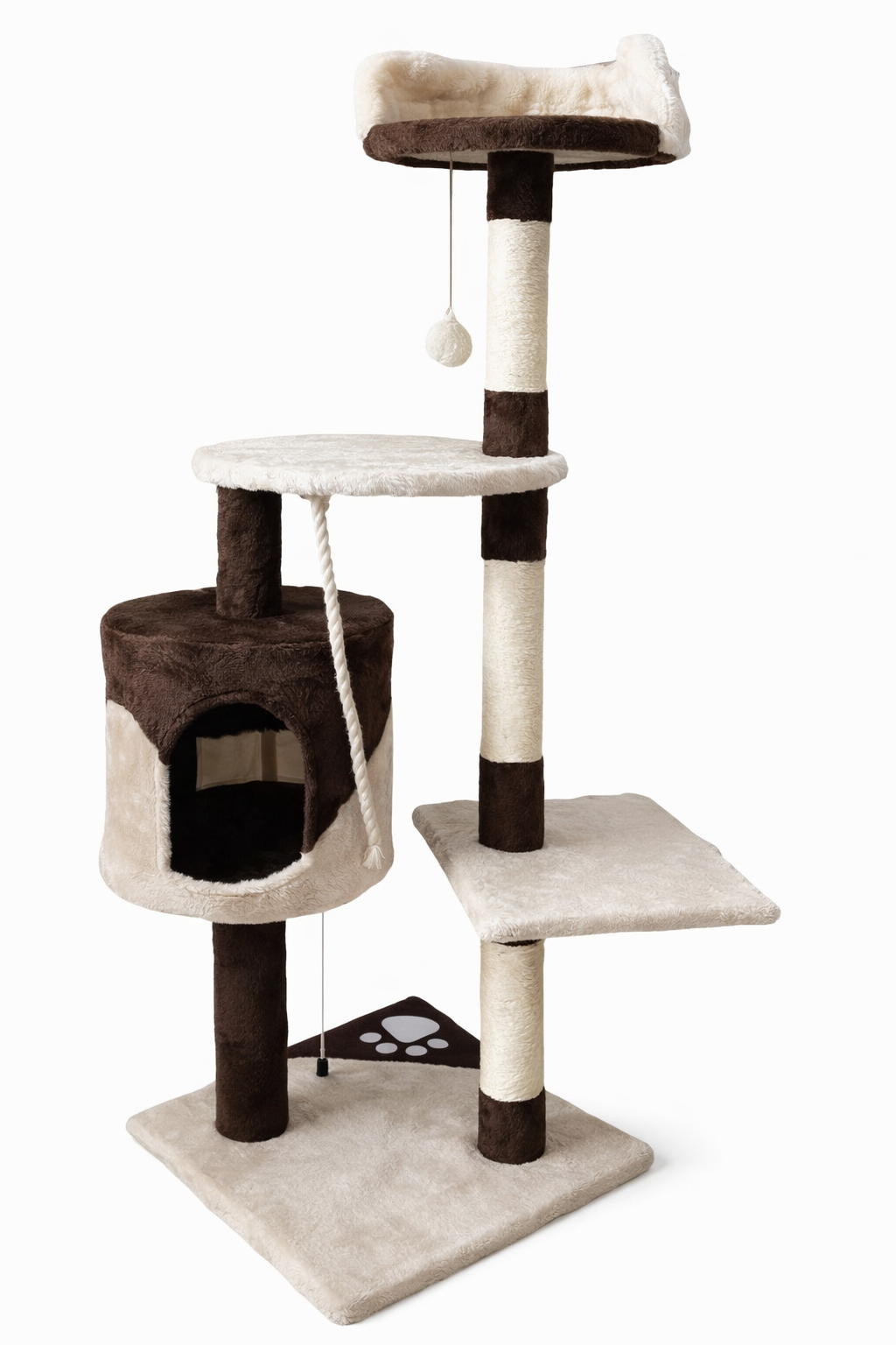 Klorestativ i brun og beige med hule, platformer og tau til leking.